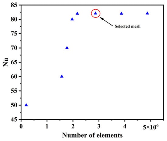 The computational domain was discretized using ANSYS Meshing 2019, with a refined mesh near the absorber wall and the segmented annular rings to accurately capture strong gradients in temperature and velocity, while coarser elements were applied in the core flow region to reduce computational time (Figure 4). To verify grid independence, several mesh densities were tested, ranging from 5 × 105 to 5 × 106 elements. As shown in Figure 5, the Nusselt number (Nu) increases significantly with mesh refinement up to around 2.8 × 106 elements, after which the variation becomes negligible. This indicates that the numerical solution is independent of further grid refinement. Therefore, the mesh containing approximately 2.0 × 106 elements was selected for all subsequent simulations, providing a suitable compromise between accuracy and computational cost.