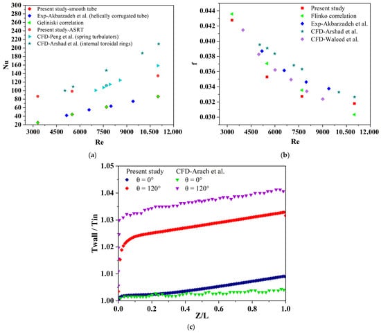 Comparison between CFD results and standard correlations: (a) Nusselt number vs. Reynolds number; (b) friction factor vs. Reynolds number; (c) axial wall temperature ratio (Twall/Tin) for different circumferential angles. Present study (CFD) and comparison with experimental data of Akbarzadeh et al. [33] and numerical results of Peng et al. [32], Waleed et al. [28], Arshad et al. [14] and Arach et al. [10].