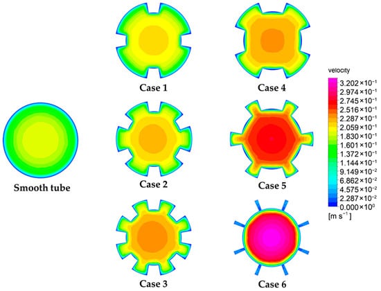 Figure 7 illustrates the velocity contours at the mid-section (700 mm) for the smooth tube and the ASRT configurations (Cases 1–6). The numerical analysis was conducted at a Re of 3300, corresponding to an inlet velocity of 0.15 m/s. In the smooth tube, the flow exhibits a classical parabolic velocity distribution, where the maximum velocity reaches approximately 0.26 m/s in the core region and progressively decreases toward the wall because of viscous effects. This uniform and symmetric pattern reflects a fully developed laminar to turbulent transition typical of low-Reynolds internal flows. When the ASRT inserts are introduced, the internal flow field becomes noticeably more complex. The segmented annular rings interrupt the boundary layer symmetry and generate localized recirculation zones downstream of each segment, enhancing axial momentum redistribution and promoting convective mixing. A comparison between Case 1 and Case 2, which isolates the effect of the Nr, shows that adding additional segments increases the number of small secondary vortices, yet their influence on the overall flow structure remains moderate. In contrast, comparing Case 1 and Case 4, which examines the influence of the α, reveals a substantial modification of the velocity field. Enlarging α widens the high velocity core region and intensifies the acceleration of fluid between adjacent ring gaps, leading to stronger shear layers and improved near-wall mixing. These results confirm that the combined increase in α promotes a more vigorous axial transport and better mixing between the core and near-wall regions, leading to a more uniform velocity distribution along the tube [34].