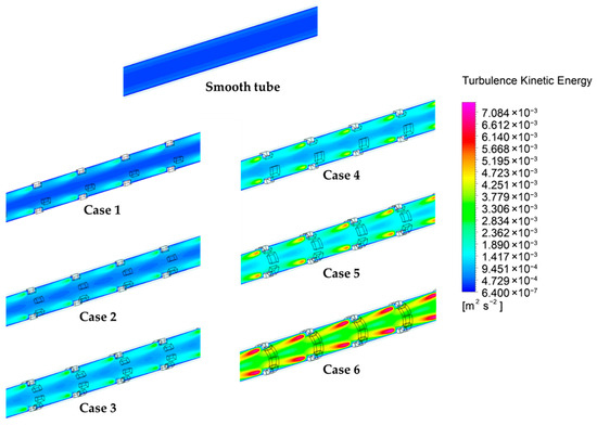 Figure 8 presents the turbulent kinetic energy (TKE) contours along the absorber tube for the smooth configuration and the six ASRT geometries (Cases 1–6). For the smooth tube, the turbulence intensity remains very low (around 6.4 × 10−7–9.4 × 10−4 m2/s2) and nearly uniform throughout the core, reflecting a laminar-like velocity field with negligible fluctuations. In Case 1, the introduction of four angularly segmented rings slightly enhances local turbulence downstream of each segment, forming small recirculating zones with limited interaction. As the number of rings increases (Cases 2 and 3), the TKE peaks rise to the order of 2.3 × 10−3–3.8 × 10−3 m2/s2, indicating the generation of stronger shear layers and enhanced energy dissipation near the ring edges. The influence of angular spacing becomes more evident in Cases 4 to 6, where larger angular offsets between successive rings promote a stronger periodic disturbance along the tube. In particular, Case 6 exhibits the most pronounced turbulent activity, with TKE values reaching approximately 7.0 × 10−3 m2/s2. This is attributed to the combined effects of increased angular spacing and multiple interacting vortices that intensify mixing and momentum exchange between the core and near-wall regions [35]. Overall, the ASRT configurations demonstrate a progressive amplification of turbulent energy with both the number of rings and angular spacing, confirming the geometry’s effectiveness in enhancing internal flow agitation and, consequently, convective heat transfer.