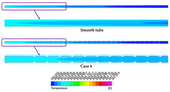 Figure 9 depicts the temperature contours of the working fluid along the entire absorber tube for both the smooth configuration and the ASRT geometry (Case 6). The temperature scale ranges from 300 K to 307.9 K, illustrating the gradual thermal evolution of the fluid from the inlet to the outlet due to continuous heat absorption through the heated wall. In the smooth tube, the temperature field remains nearly uniform along the axis, with a limited rise of approximately 6–7 K, indicating weak convective mixing and a thick, undeveloped thermal boundary layer. In contrast, the ASRT configuration exhibits a more distinct temperature gradient, with higher wall temperatures and localized hot streaks forming behind each ring segment. These alternating hot and cold regions reveal the influence of flow separation and recirculation zones generated by the angularly segmented rings. The stronger near-wall convection and intensified axial mixing result in an overall temperature increase of nearly 8 K along the tube length, confirming the enhanced convective heat exchange. The zoomed view near the outlet clearly highlights this effect: the smooth tube preserves a relatively laminar thermal pattern, whereas the ASRT case shows periodic fluctuations in the temperature field due to the interaction between successive vortical structures. This periodic alternation of warm and cool streaks demonstrates the direct coupling between turbulence generation and heat transfer enhancement within the absorber.