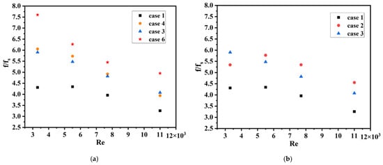 Variation of the friction factor ratio with Reynolds number for different ASRT configurations. (a) Comparison among cases 1–6 for the first series of geometries; (b) Comparison among cases 1–3 for the second series of geometries.