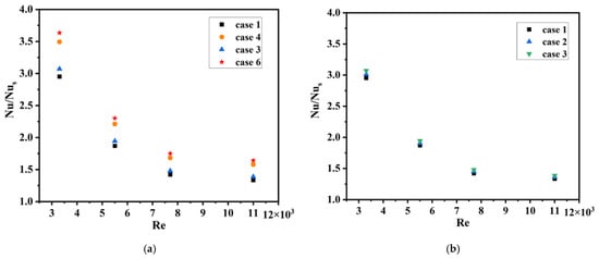 Variation of the Nusselt number ratio with Reynolds number for different ASRT configurations. (a) Comparison among cases 1–6 for the first series of geometries; (b) Comparison among cases 1–3 for the second series of geometries.