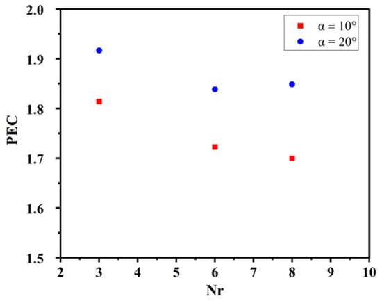 Variation of the performance evaluation criterion (PEC) with the number of rings (Nr) for two angular spacings (α = 10° and 20°).