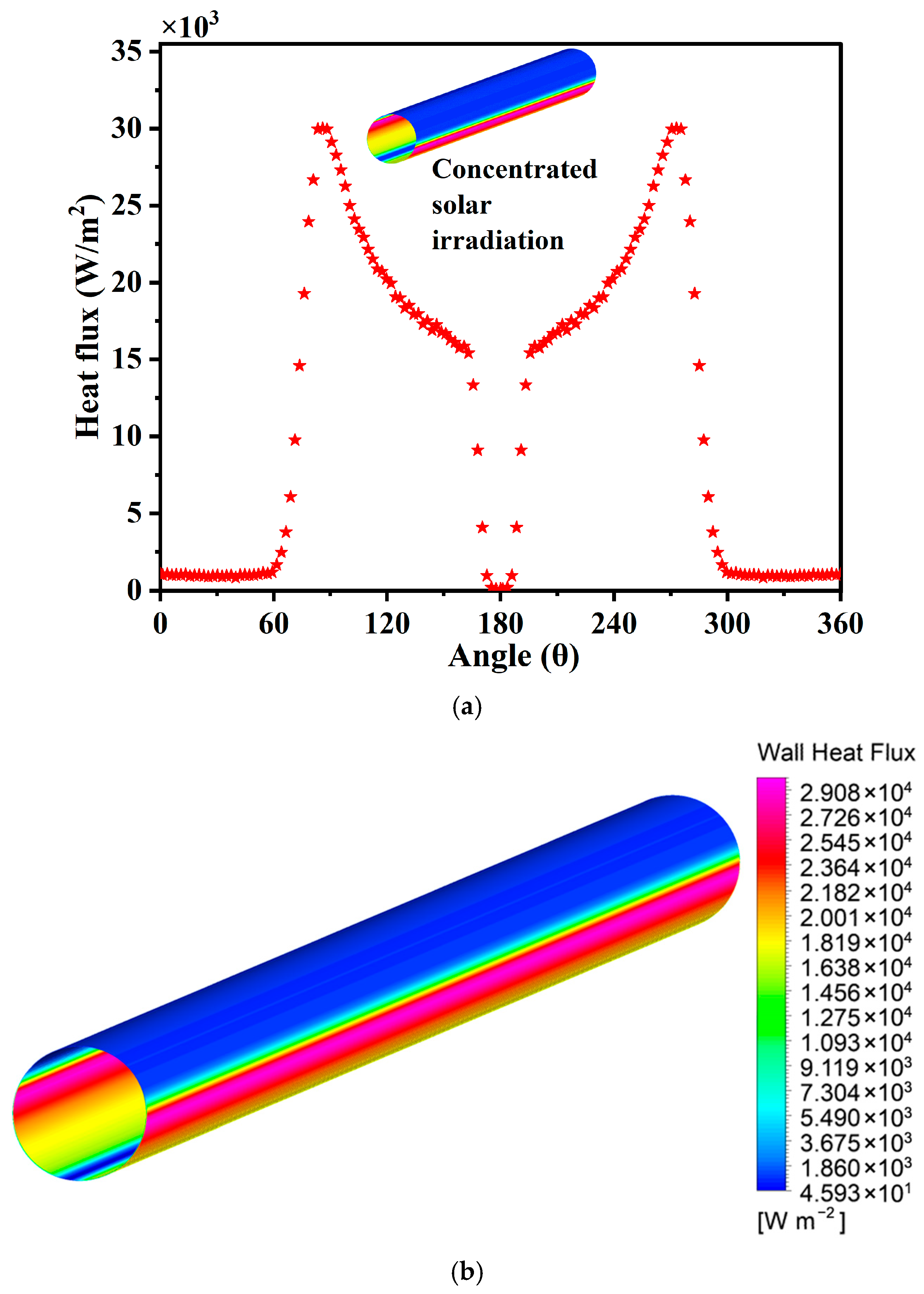 28], the flux exhibits a pronounced asymmetry, with the highest intensity concentrated on the upper illuminated region of the absorber and a gradual decrease toward the lower shaded side. This behavior reflects the intrinsic optical characteristics of parabolic trough concentrators and ensures the physical relevance of the imposed boundary condition.