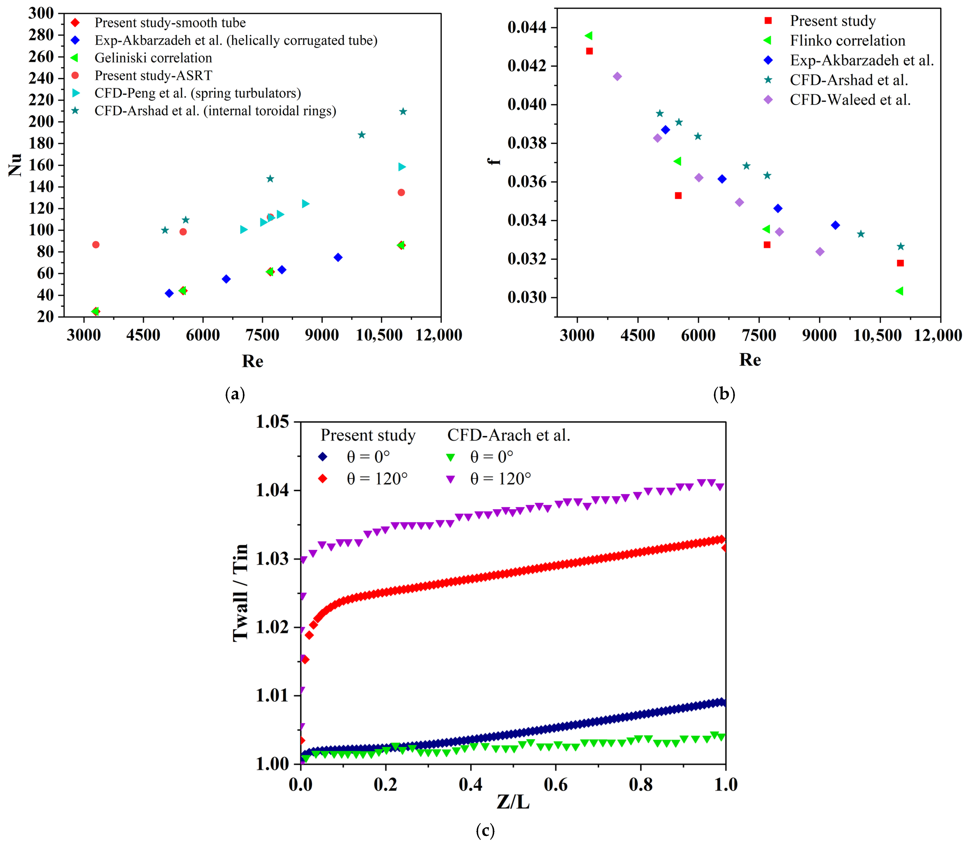 Figure 6a, the Nusselt numbers predicted for the smooth tube agree well with the Gnielinski correlation, whereas the ASRT configuration exhibits a noticeable increase in convective heat-transfer performance.
