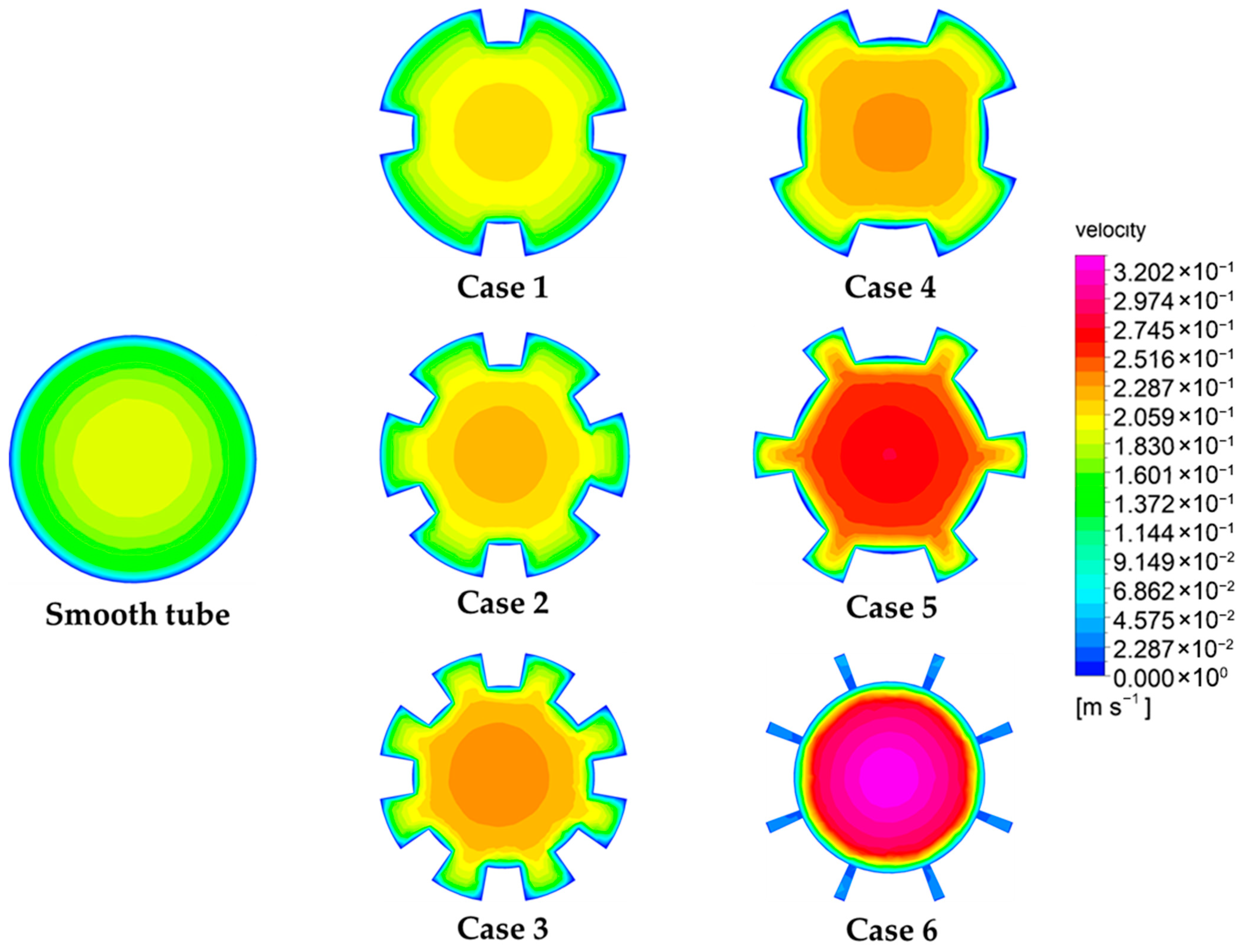 Figure 7 illustrates the velocity contours at the mid-section (700 mm) for the smooth tube and the ASRT configurations (Cases 1–6). The numerical analysis was conducted at a Re of 3300, corresponding to an inlet velocity of 0.15 m/s. In the smooth tube, the flow exhibits a classical parabolic velocity distribution, where the maximum velocity reaches approximately 0.26 m/s in the core region and progressively decreases toward the wall because of viscous effects. This uniform and symmetric pattern reflects a fully developed laminar to turbulent transition typical of low-Reynolds internal flows. When the ASRT inserts are introduced, the internal flow field becomes noticeably more complex. The segmented annular rings interrupt the boundary layer symmetry and generate localized recirculation zones downstream of each segment, enhancing axial momentum redistribution and promoting convective mixing. A comparison between Case 1 and Case 2, which isolates the effect of the Nr, shows that adding additional segments increases the number of small secondary vortices, yet their influence on the overall flow structure remains moderate. In contrast, comparing Case 1 and Case 4, which examines the influence of the α, reveals a substantial modification of the velocity field. Enlarging α widens the high velocity core region and intensifies the acceleration of fluid between adjacent ring gaps, leading to stronger shear layers and improved near-wall mixing. These results confirm that the combined increase in α promotes a more vigorous axial transport and better mixing between the core and near-wall regions, leading to a more uniform velocity distribution along the tube [
