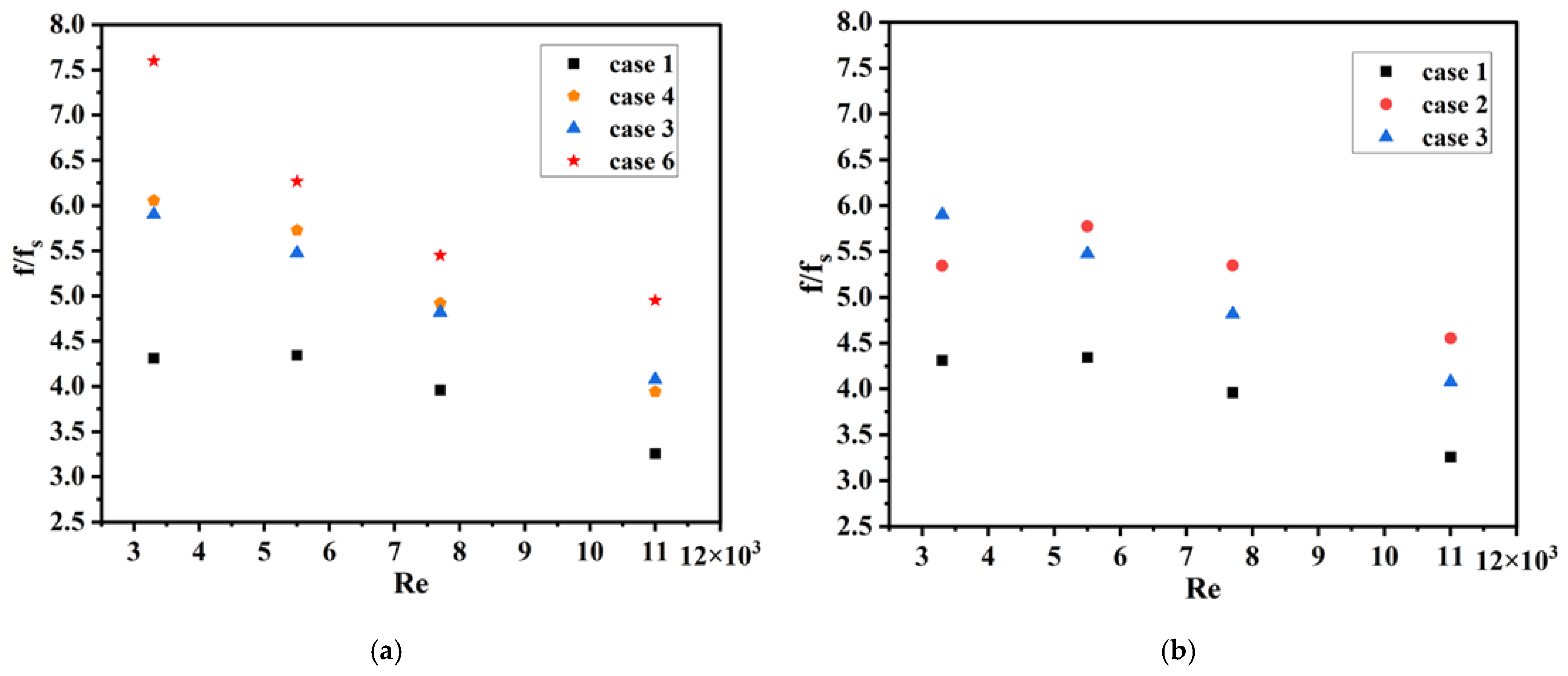 drops from approximately 6.0 → 4.0 for Case 3 and from 5.2 → 3.9 for Case 2 as Re increases from 3300 to 11,000. The increase in