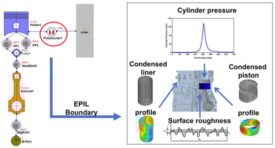 The multibody dynamics simulation model is shown in Figure 2, To ensure model fidelity, the piston, connecting rod, gudgeon pin, and cylinder liner were modeled as elastic bodies. Introducing surface profiles on the cylinder liner and piston skirt strongly influences the tribological behavior of the interface, even though the resulting quantities are typically small in magnitude []. Therefore, obtaining reliable predictions requires explicit consideration of the finite deformability of all components. The deformed shapes of these parts were obtained from an FST multi-physics coupled analysis (in Section 2.3) and incorporated into the multibody model.