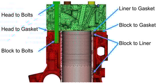 To simulate the deformation of the cylinder liner and piston, CFD analysis of the cooling jacket was first performed using AVL FIRE 2023. The calculated temperature and convection heat transfer coefficients were then imported into Abaqus 2022 to carry out the thermo-mechanical coupled deformation analysis. The model was constructed based on the actual geometry and discretized with tetrahedral elements. As illustrated in Figure 3, six critical contact surface were defined within the assembly: cylinder head–bolt (tie constraint), cylinder head–gasket, liner–gasket, block–liner, block–gasket, and block–bolt.