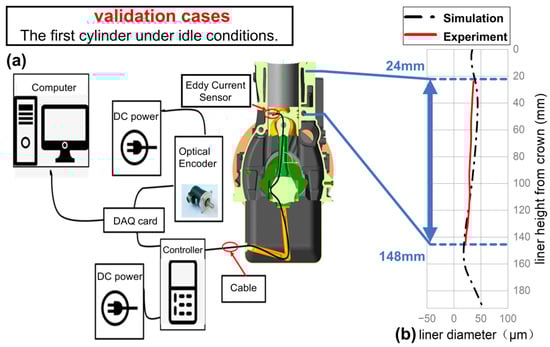 The predictive capability of the simulation model was assessed through experimental correlation. A specialized test bench, depicted in Figure 6a, was utilized to acquire real-time measurements of cylinder liner deformation and piston kinematics []. The equipment used in Figure 6a is listed in the accompanying Table 3.
