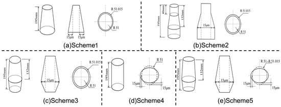 Informed by the mechanical and thermal loads on the cylinder liner and by deformation simulations of the engine in its initial configuration, five pre-compensation designs were developed. The pre-compensation schemes were as follows: a tapered liner (a) Scheme 1, a bottleneck-shaped liner; (b) Scheme 2, a spindle-shaped liner; (c) Scheme 3, an elliptical liner; (d) Scheme 4, and an elliptical–spindle composite liner; and (e) Scheme 5. The dimensional schematics of these five designs are shown in Figure 7 [].