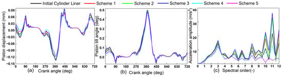To further analyze the effect of liner shape on piston-slap excitation, the piston’s lateral acceleration along the major and minor thrust directions over one working cycle was extracted and analyzed. Applying a Fourier transform to this time-domain signal yielded acceleration amplitudes at various harmonics. As shown in Figure 9c, Schemes 1–3 significantly increased the lateral-acceleration amplitude, which is detrimental to mitigating piston–cylinder slap. In contrast, Schemes 4 and 5 exhibited lower lateral-acceleration amplitudes than the initial cylinder liner, indicating effective mitigation of piston–cylinder slap.