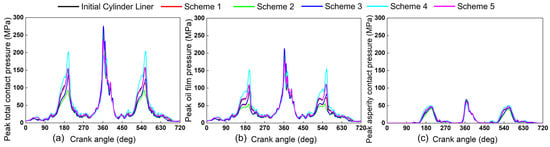 Contact pressure simulation results for different schemes. Subfigures: (a) peak total contact pressure; (b) peak oil film pressure; (c) peak asperity contact pressure.