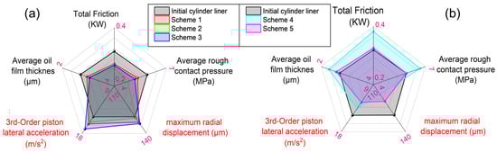 Based on a comprehensive comparison of piston dynamics, skirt friction, and lubrication among Schemes 1–5 and the initial cylinder liner, Figure 13 shows the comparison across all schemes.