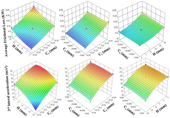 Greater response surface curvature indicates more significant parameter interaction effects on Y1/Y2 []. Response–surface plots illustrating the interactive effects of H, Ct, and Cl on average total friction loss and third-order lateral acceleration are shown in the corresponding Figure 15.