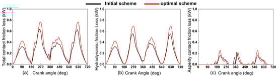 Comparison of friction losses at the piston skirt before and after optimization. Subfigures: (a) total contact friction loss; (b) hydrodynamic contact friction loss; (c) asperity contact friction loss.