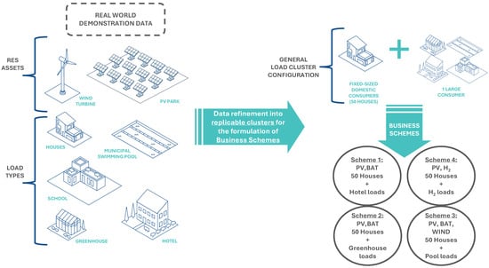 The transition from the diverse, site-specific Community Energy Lab (CEL) configurations described in Section 2 to replicable modular business schemes requires the development of a systematic optimization and energy management framework. The modular schemes presented in Figure 1 provide a common baseline of 50 residential houses plus one large consumer per sector (domestic, tourism, municipal, transport). To ensure comparability among the four sectoral schemes, the baseline residential cluster was standardized at 50 units. Hourly load data originally obtained from CEL demonstrations and literature (single-house datasets) were linearly scaled to account for the cluster size chosen (50 units). The 50-unit reference reflects the scale of modern European energy community pilots and demonstration clusters, which commonly comprise 40–100 households in practice, as exemplified by sites in the RESCHOOL project, the Energy Communities Repository, and recent European Commission initiatives [2,30,31]. This approach allows for direct comparison of technically optimal technology configurations and supports the development of scalable business models that can be easily replicated across similar contexts.