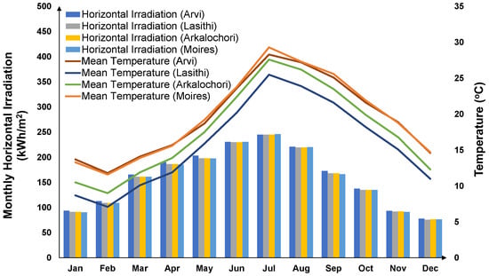 The four CEL locations, Arvi, Lasithi Plateau, Arkalochori, and Moires, exhibit strong and varied renewable energy profiles typical of Mediterranean climates. Each site features abundant solar radiation and wind potential, with monthly and seasonal profiles that influence both RES and broader system performance. Figure 2 illustrates the monthly global horizontal irradiation and mean temperature for the demonstration regions, drawing from PVGIS data and meteorological records [22].