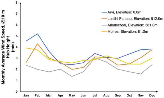 These annual and monthly trends set key boundary conditions for technology selection, sizing decisions, and operational strategies across all CELs. While the solar resource is high and relatively stable, intra-annual variation and short-term intermittency are present, requiring the inclusion of energy storage and sector-coupling solutions to effectively balance generation and demand. Wind resources, where present (notably Arkalochori), offer additional support, particularly during evening hours and winter months when solar output may be reduced. Wind speed data for the selected sites were obtained also from the PVGIS database to accurately characterize the wind resource available for energy conversion and measurements were taken at reference height. The annual wind speed profiles exhibit notable seasonal and diurnal variability, with higher wind speeds typically observed during the winter months and at night, complementing the solar generation profiles. This complementary behavior enhances the overall renewable energy potential and provides valuable balancing capabilities for hybrid energy systems modeled in the study (specifically Scheme 3). Figure 3 presents the monthly averages for wind speed in m/s across the four locations selected for the Schemes.