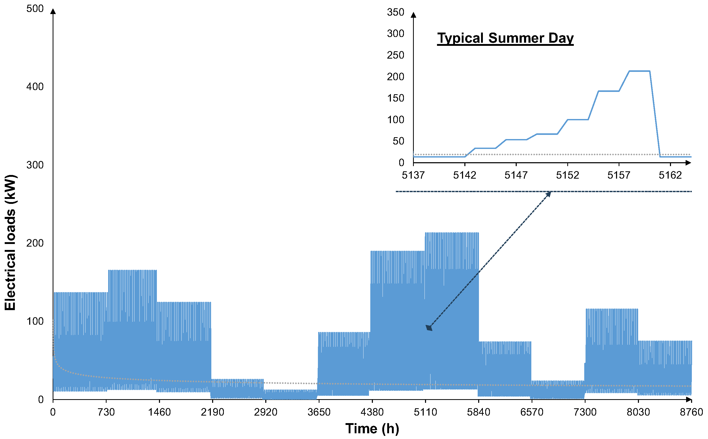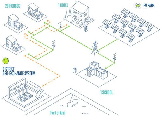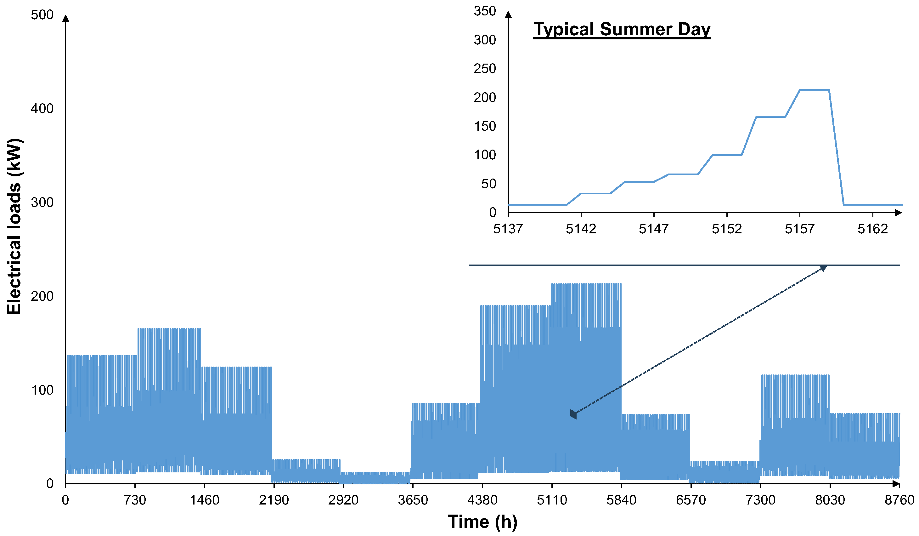 - Scheme 1 (Domestic and tourism sectors): 50 residential houses and 1 hotel (1000 m2, 100 guests), integrating photovoltaics and battery storage to address combined electrical and thermal loads typical of tourism-oriented communities.