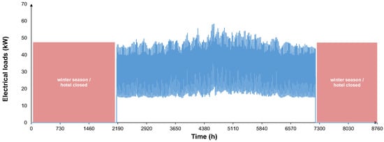 Hourly electrical load profile in the course of one year for the case of the hotel building in scheme 1. Hotel remains closed during the winter period.