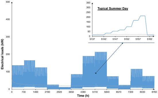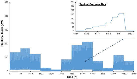 The hotel establishment in Arvi spans 1000 m2 across four floors with 20 rooms and accounts for approximately 3000 annual guests. It operates from April 1st to the end of October. The electrical load demand, which incorporates heating and cooling needs expressed as electrical consumption (with a COP of 3), is estimated at 25 kWhe per guest. The stochastic profile generated based on these assumptions illustrates the hotel’s annual electrical load is shown in Figure 5.