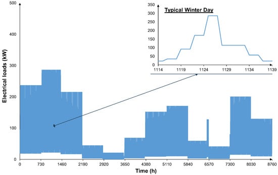Hourly electrical load profile in the course of one year for the case of the residential buildings (50 houses) and a typical winter day in Scheme 3.