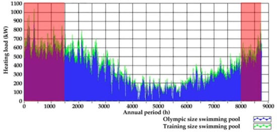 Annual heating load of the two swimming pools in the Arkalochori sports center in scheme 3 [17]. Only the Olympic sized pool is considered for the simulations. Red areas in the beginning and end of the annual period represent loads that are not considered in the analysis.