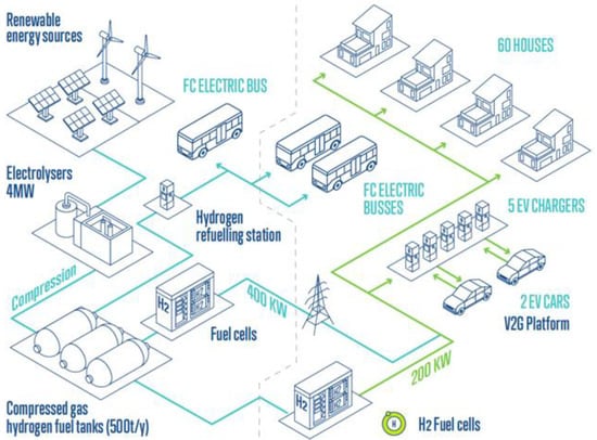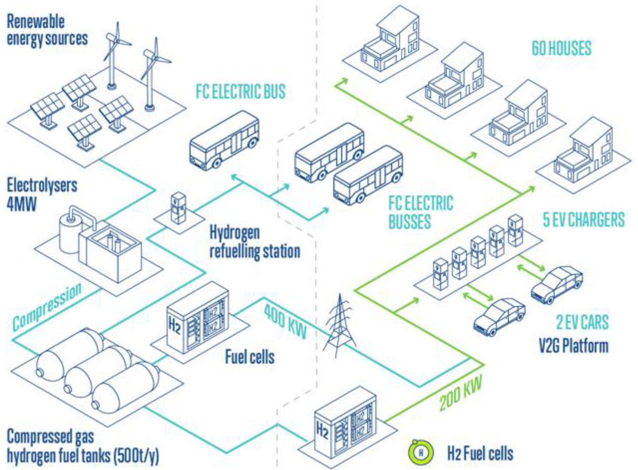 - Scheme 4 (Domestic and transport sectors): 50 residential houses and transport infrastructure (1 hydrogen fuel cell bus), utilizing photovoltaic systems integrated with hydrogen production, storage, and fuel cell (FC) technologies to enable comprehensive transport sector coupling.