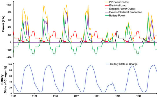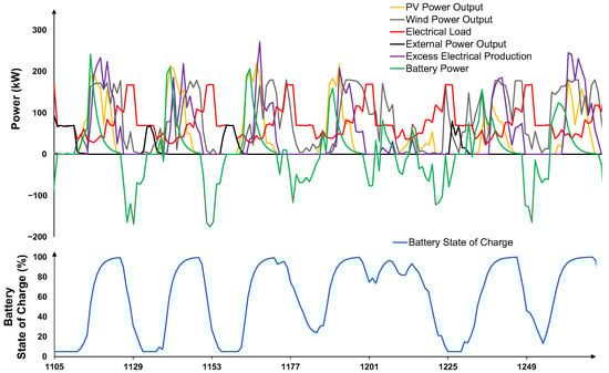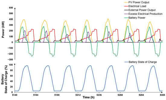 Figure 14 illustrates the operational dynamics of Scheme 1, focused on the tourism sector, during a typical summer week (1st week of August). The operational patterns observed are a direct result of the tailored EMS formulated specifically for this tourism-focused configuration. In this period, PV power generation closely follows the daily solar pattern, peaking at midday, which aligns well with the electrical load demand driven by residential cooling and hotel occupancy increased activities in summer. The battery energy storage system actively charges during periods of excess PV generation and discharges to meet evening and night loads when solar generation ceases, effectively smoothing the daily energy profile according to the battery-first dispatch strategy embedded in the EMS. Notably, the battery state of charge displays daily cyclical behavior reflecting this charge–discharge pattern, ensuring energy availability for evening consumption and reducing reliance on the external grid supply as prioritized by the EMS hierarchy. Excess electrical production occurs primarily during peak midday solar hours exceeding local demand and battery charging capacity, indicating potential for further integration of flexible loads or increased storage capacity. The EMS successfully demonstrates effective battery-first dispatch strategy and high utilization of locally generated solar power tailored to the specific tourism sector load patterns.