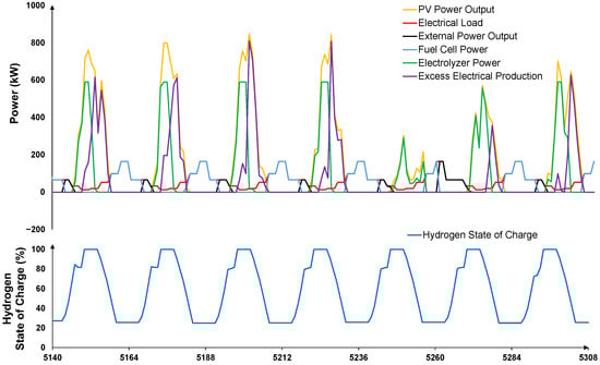Figure 17 illustrates the operational behavior of Scheme 4 (transport sector) over a representative summer week. PV generation peaks at midday, supplying both immediate electrical loads and the electrolyzer for hydrogen production. The electrolyzer operates primarily during high solar output hours, converting surplus PV into hydrogen stored in the tank (lower panel). Stored hydrogen is then dispatched via the fuel cell during evening and early-morning periods when PV is unavailable, meeting both residential and electrolyzer load demands. The hydrogen bus refueling demand creates distinct storage drawdowns, shown as step decreases in tank level. External source imports are nearly eliminated, reflecting the EMS’s strict priority: direct PV use, hydrogen production, fuel cell dispatch, and only then external source back-up. This scheme demonstrates effective sector coupling, leveraging hydrogen as a medium for both stationary and mobility loads in a high-irradiance context.