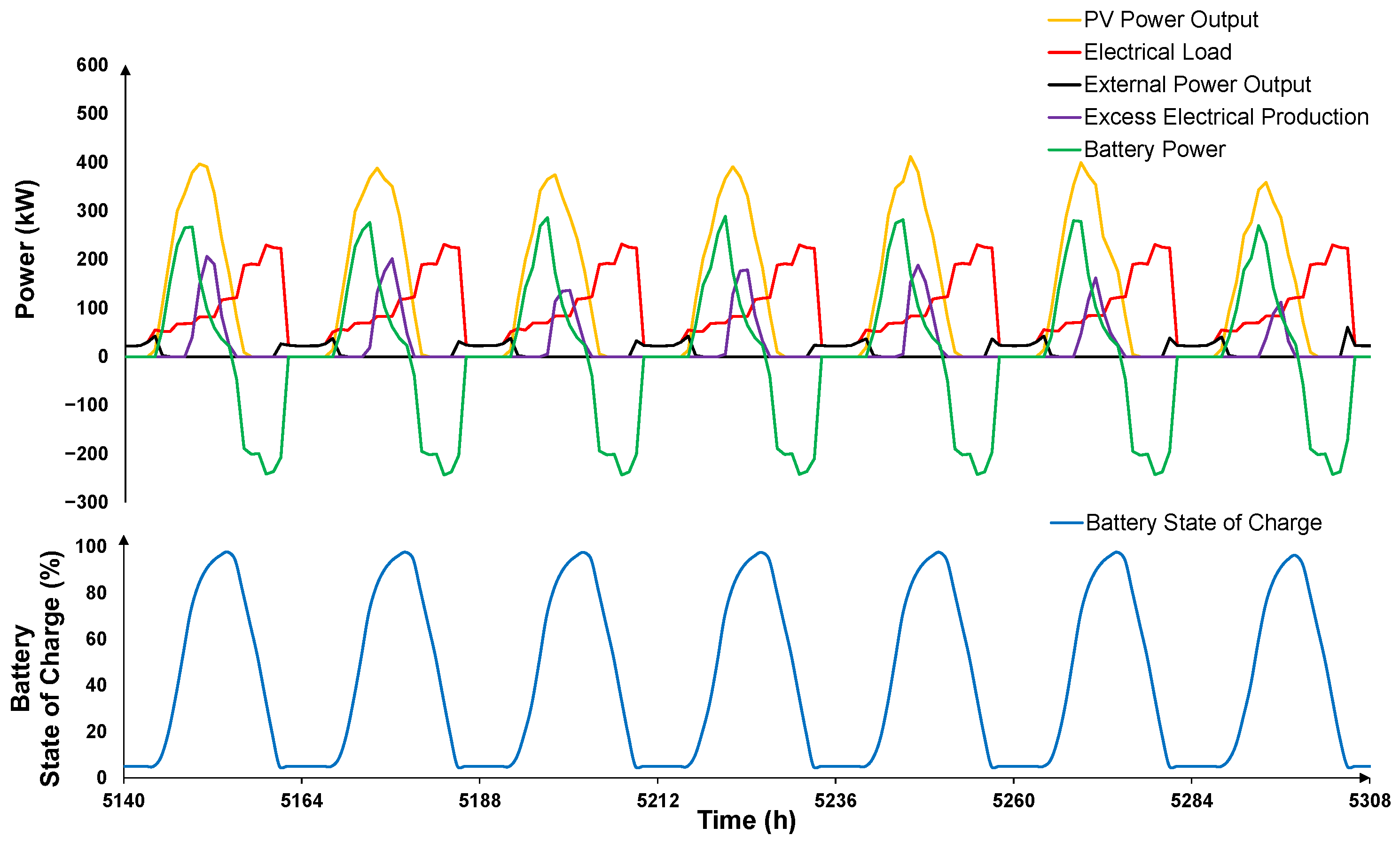- Battery charging: Surplus renewable electricity, when available and local electrical demand is met, is directed to charge the BESS until its maximum capacity is reached. This implements a “battery-first dispatch” strategy.