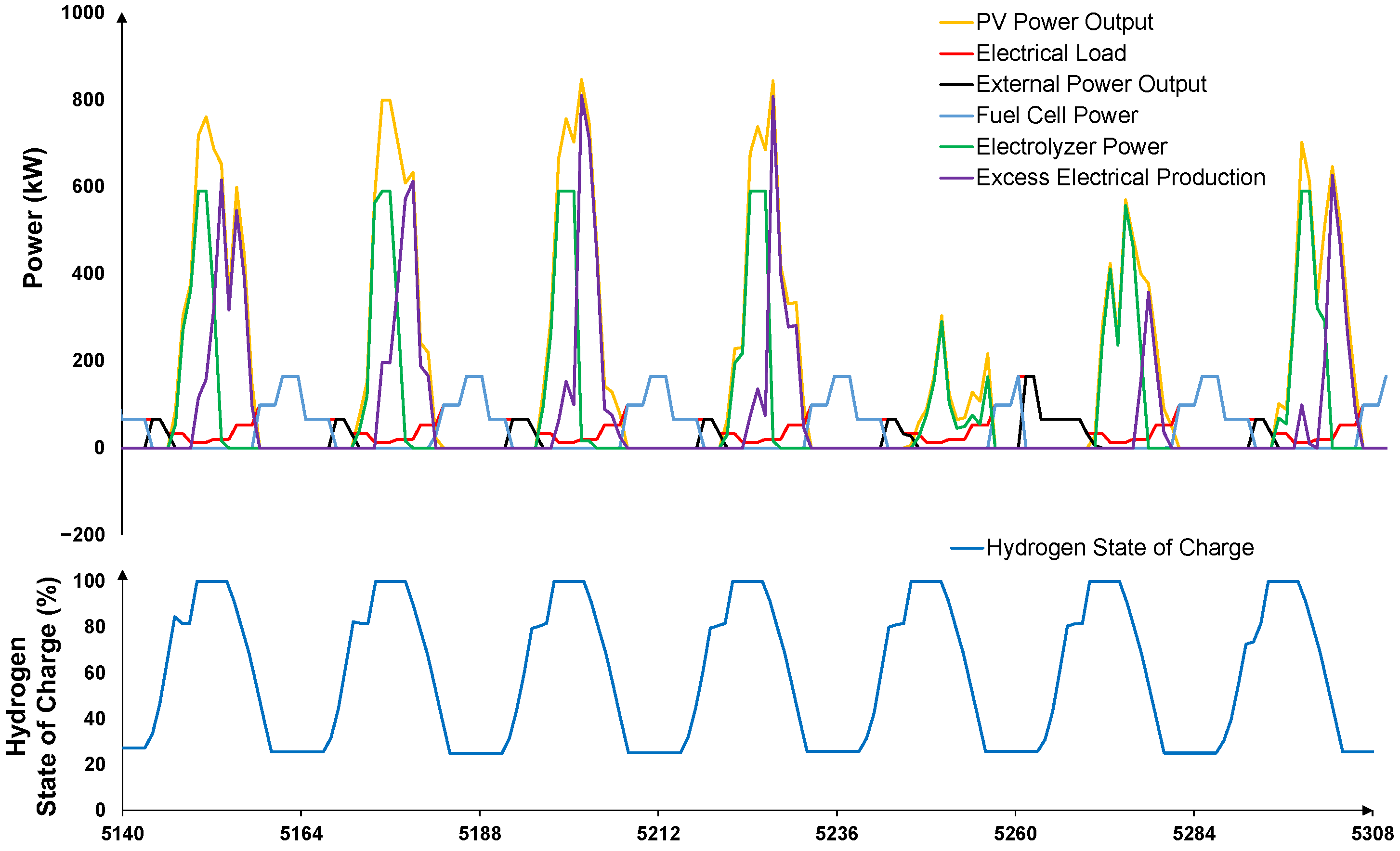 - Fuel cell dispatch: If battery storage is depleted, the hydrogen fuel cell converts stored hydrogen back into electricity to meet the remaining electrical demand. This provides dispatchable power and enhances energy autonomy.