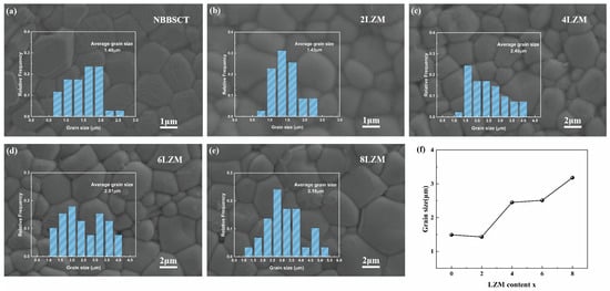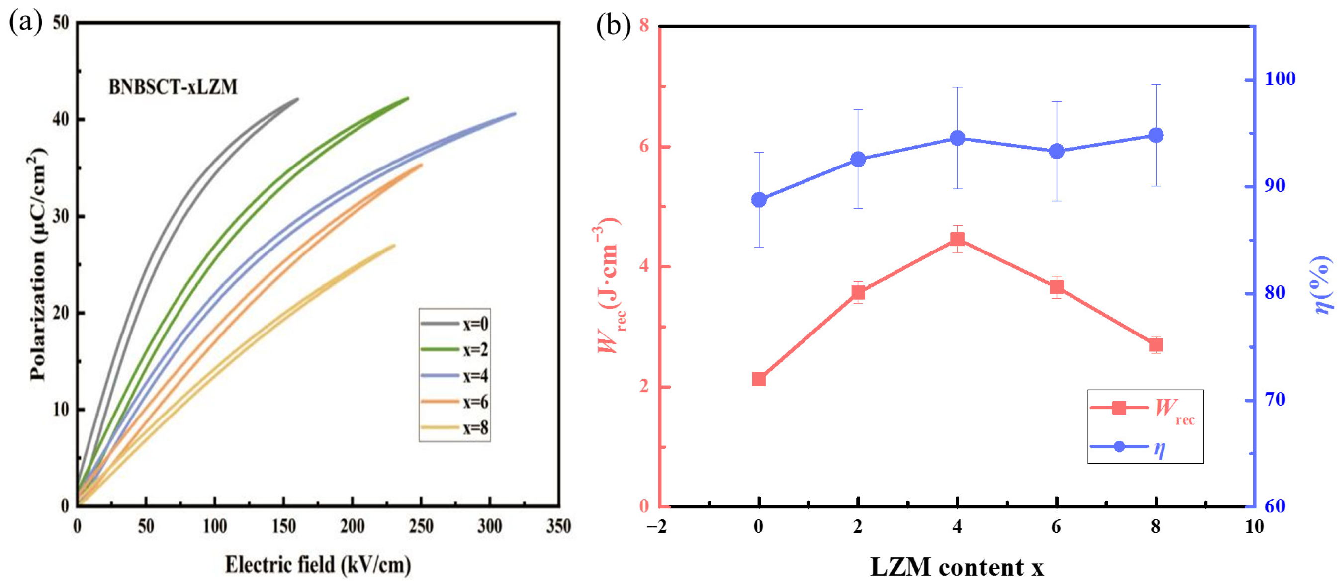 - Niu, Y.; Zhang, F.; Zhang, Z.; Li, M.; Liu, J.; Wang, Z. Improving energy-storage performance of (Bi0.5Na0.5)0.94Ba0.06TiO3-based high-entropy ceramics by A/B-site co-regulation. Ceram. Int. 2025, 51, 25182–25191. [Google Scholar] [CrossRef]