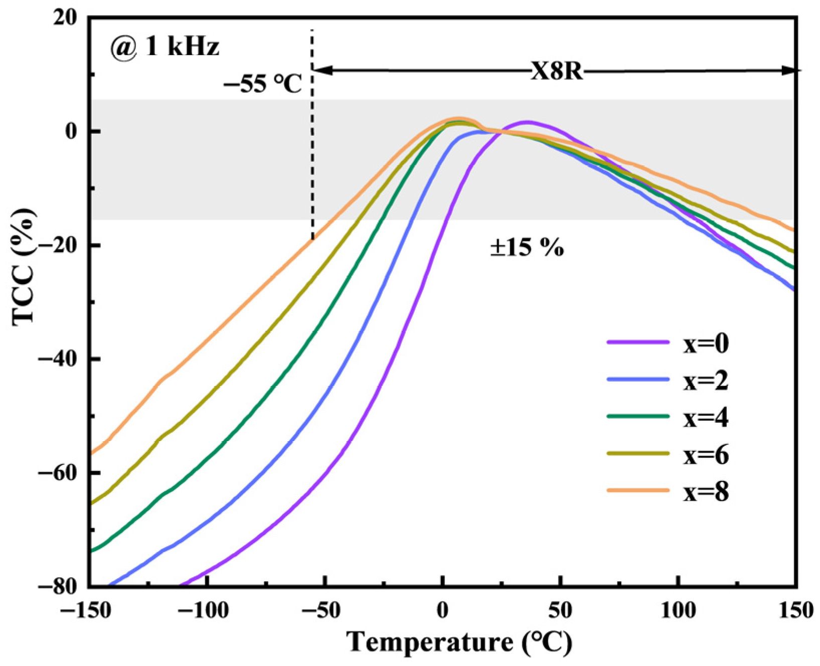 - Zhang, Y.Y.; Wang, D.; Li, Q.; Liu, H.; Sun, S.K.; Cui, Z.; Li, L.L.; Li, C.C.; Li, J.; Li, W. Medium temperature sintered BaTiO3-based ceramics for X8R capacitors. J. Materiomics 2025, 11, 123–130. [Google Scholar] [CrossRef]