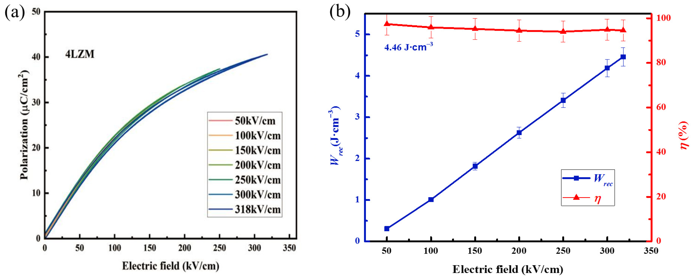 | This work | 0.96(NaBiBa)0.205(SrCa)0.1925TiO3-0.04La(Zr0.5Mg0.5)O3 | 318 | 4.46 | 94.55 |