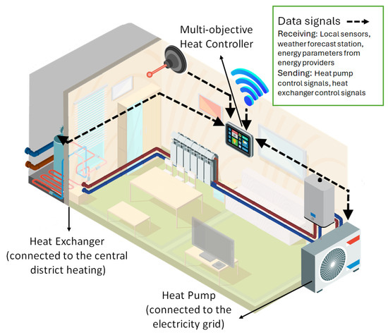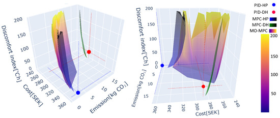 - A multi-objective predictive controller designed to consider cost, emissions, and comfort level of the building’s indoor environment. The hybrid heating system is supplied by a heat pump and district heating.