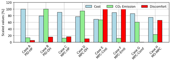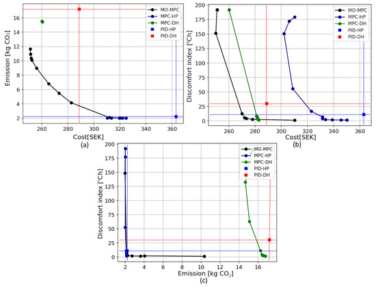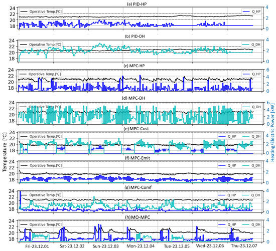| [15] | MPC, PID | White | Heat pump | Economic, environment | An MPC with different penalty weights was assessed. Depending on the weights, savings on cost and emissions can be achieved. |