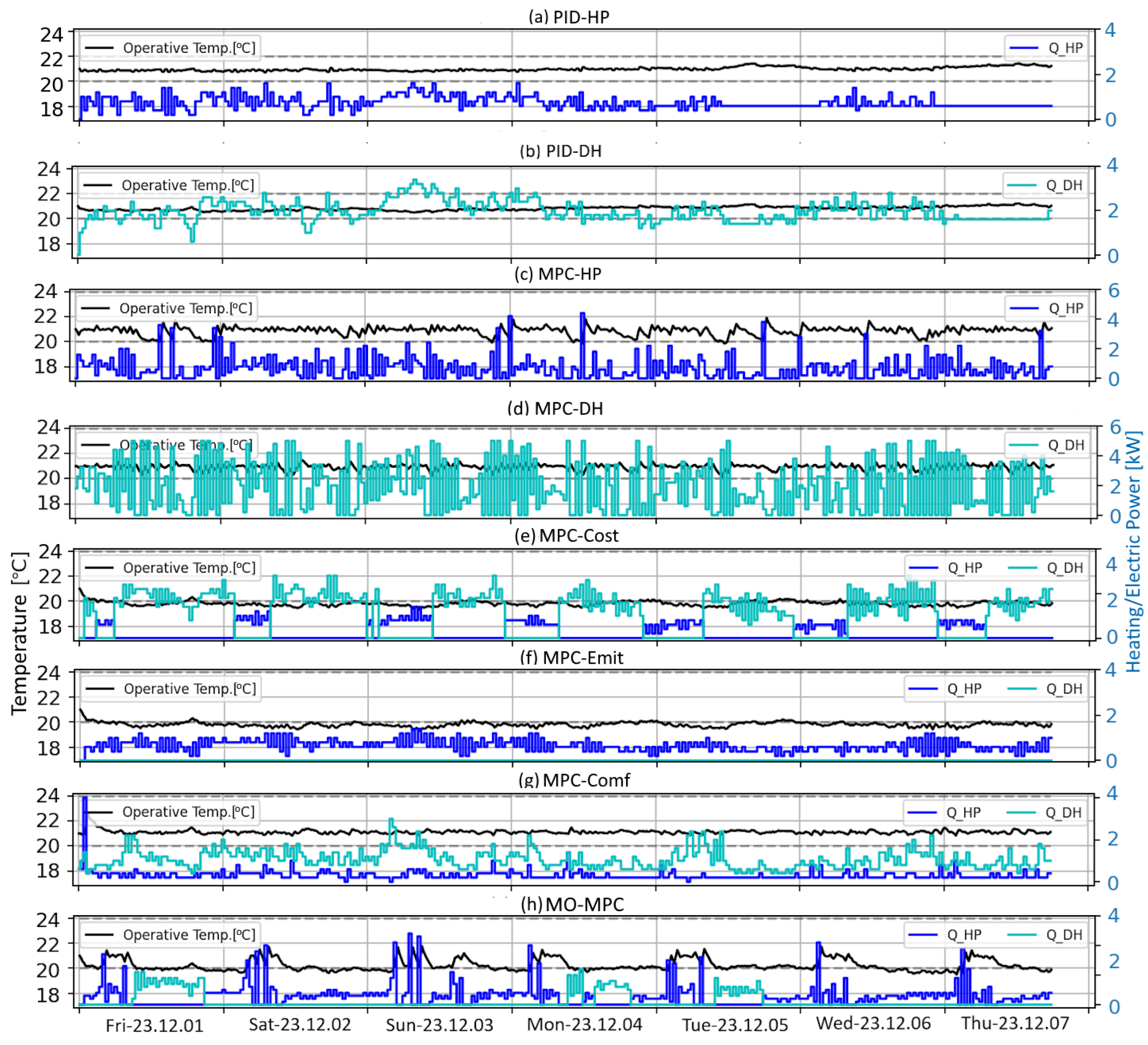 | This paper | MPC, PID | Gray | District heating, heat pump | Economic, environment, comfort | (refer to Section 3). |