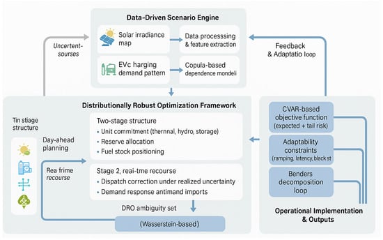 Figure 1 illustrates the overall workflow of the proposed data-driven distributionally robust optimization (DRO) framework. At the top layer, the data-driven scenario engine integrates multi-source datasets—including solar irradiance, temperature, EV charging demand, and urban distribution topology—to capture spatiotemporal uncertainty. These raw data are preprocessed and encoded using copula-based dependence modeling, followed by Wasserstein-distance–preserving scenario generation and reduction, forming the uncertainty set for optimization. The middle layer depicts the core optimization structure, which consists of a two-stage DRO formulation. In the day-ahead stage, commitment and reserve decisions are made across generation, storage, and demand-side resources. The real-time recourse stage adapts to realized uncertainties through corrective dispatch, demand response activation, and import adjustment. A Conditional Value-at-Risk (CVaR)–based objective ensures that both expected cost and extreme-tail risks are jointly minimized, while adaptability constraints quantify the system’s ramping capability, start-up latency, and black-start resilience. The Wasserstein ambiguity set and Benders decomposition jointly enable tractable and data-consistent computation. Finally, the bottom layer summarizes operational outcomes—cost, reliability, emission performance, and dynamic flexibility—which feed back into the scenario engine for continuous model adaptation. This structure highlights that the proposed method forms a closed-loop learning and decision process capable of capturing both statistical and physical drivers of uncertainty, ensuring robust and adaptive scheduling under multi-hazard urban energy conditions.