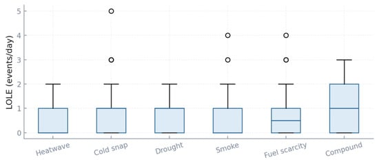 The LOLE metric in Figure 7, expressed as events per day, is mostly centered below one, but class differences remain stark. Heatwave cases cluster near 0.6 events/day, while cold snaps average closer to 0.8. Drought and fuel scarcity scenarios both sustain tails reaching two events/day. Compound scenarios again stand out, with quartiles spanning 0.6–1.5 and maximum realizations touching three events/day, equivalent to three distinct supply shortfalls in 24 h. Smoke scenarios are the least disruptive, median LOLE below 0.3. The results show that while the system is robust under isolated disturbances, the multiplicity of stressors sharply raises the likelihood of multiple failures in a single day, requiring adaptability indicators to intervene more frequently.