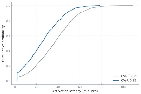 This cumulative distribution in Figure 12 shows the probability distribution of activation times for demand response events. Under CVaR 0.90, the median latency is around 35 min, with a 90th percentile near 80 min. This means that in one out of ten critical events, demand response was delayed by over an hour, a dangerous lag. Under CVaR 0.95, the median latency drops to 25 min and the 90th percentile to 55 min, showing systematically faster mobilization. The difference is operationally crucial: shaving 25 min from the upper tail can prevent load loss during rapid evening ramps. For a system peaking at 46 GW, even 500 MW of DR arriving half an hour earlier can avoid 250 MWh of unserved energy in one evening. The figure therefore illustrates that risk-sensitive policies not only allocate different resources but actively mobilize them sooner, tightening response to system shocks.