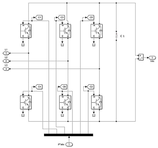 In Figure 1, the used principle of the power grid depolluting solution is depicted. According to below-delivered mathematical equations, the shunt active power filter (SAPF) is necessary. The active power filter should be connected by Point of Common Coupling (PCC). The industrial electric oven supplied by a nonlinear power converter was considered in this study [,]. The active power current references are provided both for the direct and indirect control techniques. The indirect control has been implemented in the Matlab–Simulink R2021b environment. Both the steady state and dynamic regimes are provided. The results obtained from the experimental test bench are included.