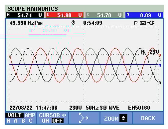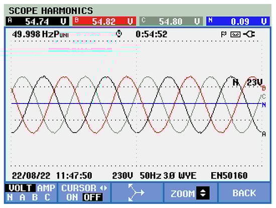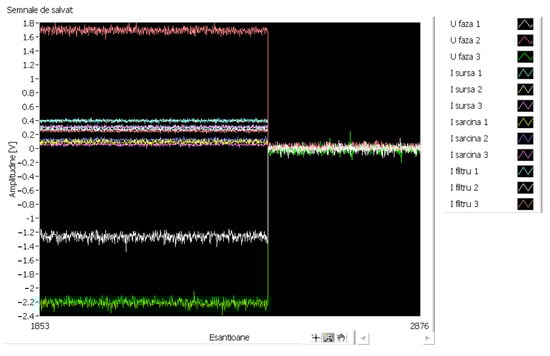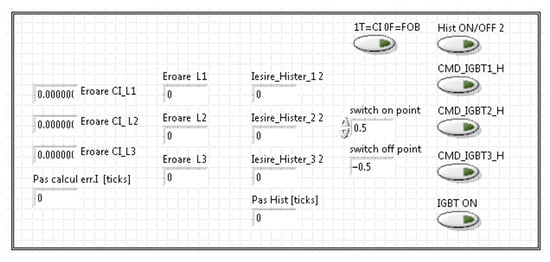 - Since the position of the voltage and current transducers can vary depending on the control strategy of the active filter, the system proposed [,] contains reconfigurable connectivity elements to reallocate the transducers to the required position. Thus, direct control systems of active power filters can be implemented without changing the position of the transducers in the experimental system. On the experimental test bench, the voltage and current transducer block consists of three voltage transducers and six current transducers, connected between the grid, the polluting consumer and the voltage inverter. Their position and the measurement direction can be modified without affecting the power circuit of the experimental stand.