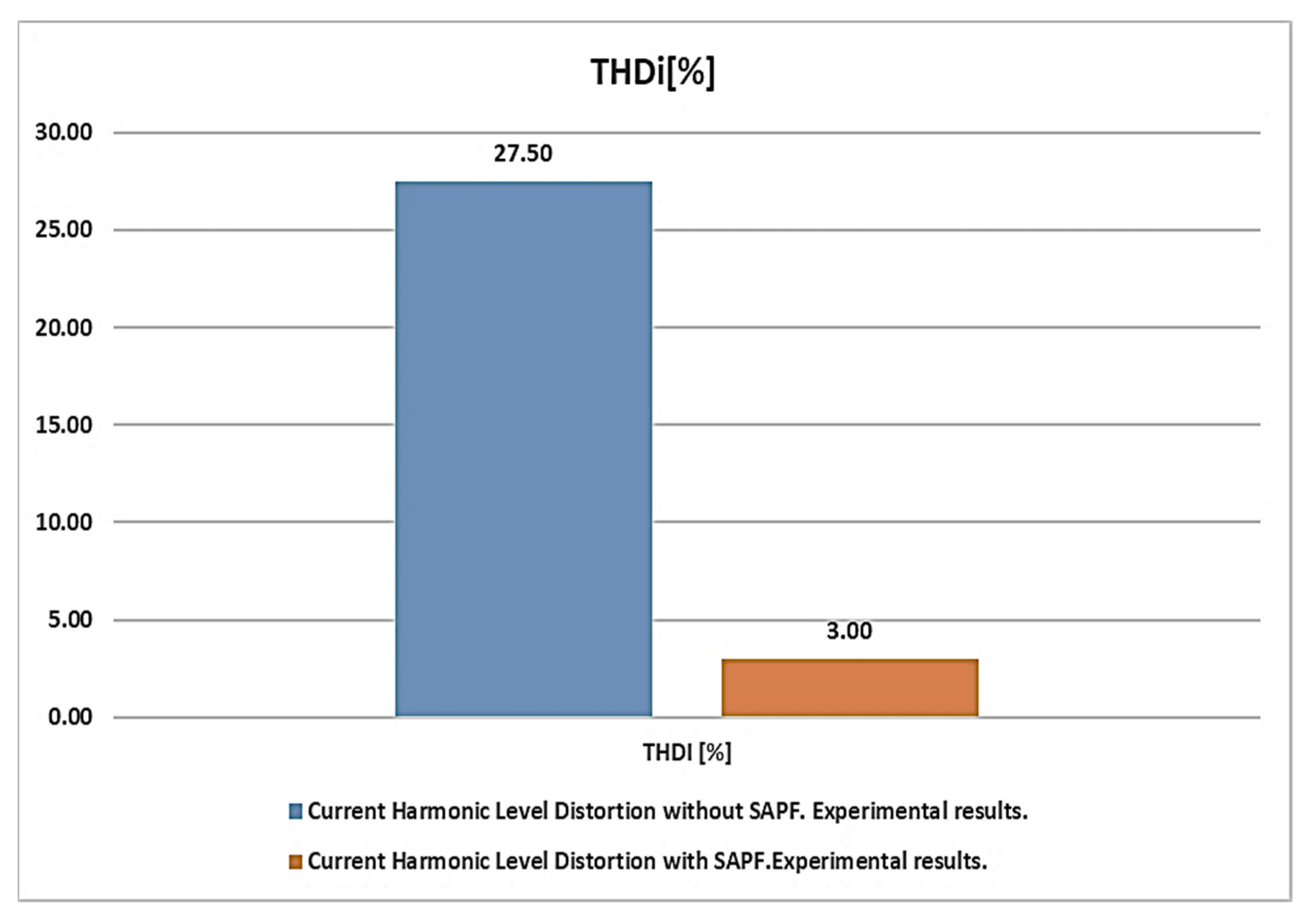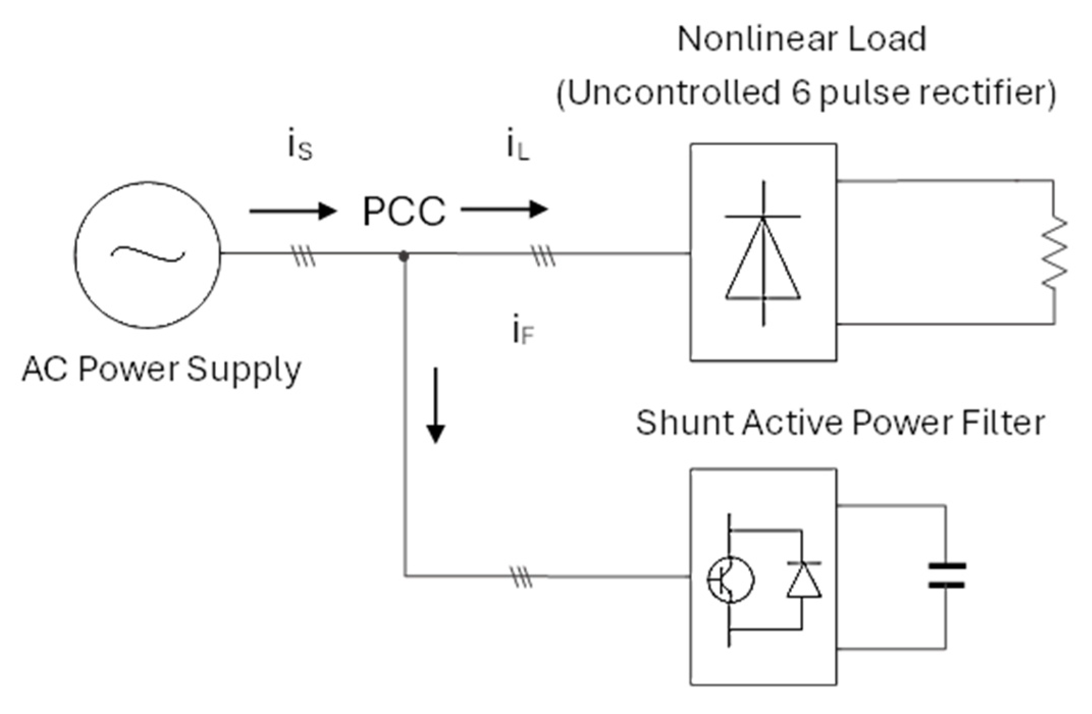 In Figure 1, the used principle of the power grid depolluting solution is depicted. According to below-delivered mathematical equations, the shunt active power filter (SAPF) is necessary. The active power filter should be connected by Point of Common Coupling (PCC). The industrial electric oven supplied by a nonlinear power converter was considered in this study [42,43]. The active power current references are provided both for the direct and indirect control techniques. The indirect control has been implemented in the Matlab–Simulink R2021b environment. Both the steady state and dynamic regimes are provided. The results obtained from the experimental test bench are included.