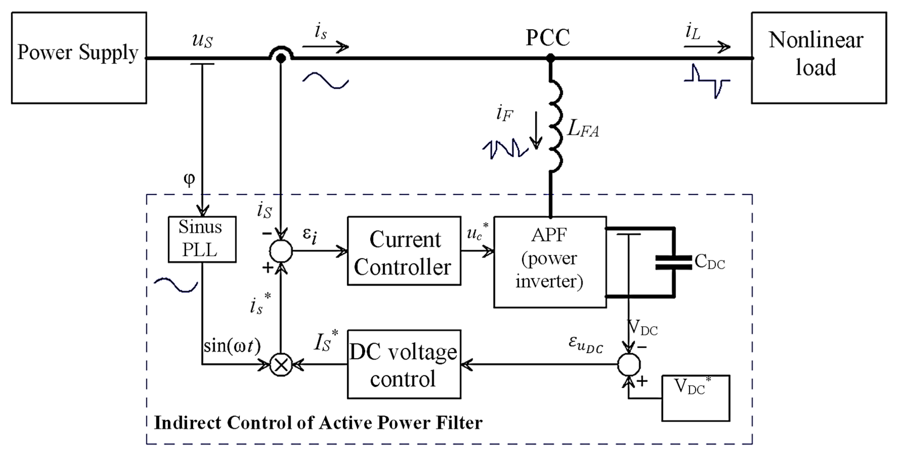 This paper contains seven sections. In the Introduction section, the power quality improvement methods are highlighted. The Materials and Methods section enumerates the control strategies implemented on the experimental testbench, classified in direct and indirect control methods. The concept of the harmonic free power system is described in the third section. Implementation of the active power filter indirect control is provided in the fourth section. The obtained numerical simulation results and the experimental results are provided in the fifth and sixth sections. At the same time, the parameters of the power system are provided in the sixth section. The last section offers the main conclusions of this work.