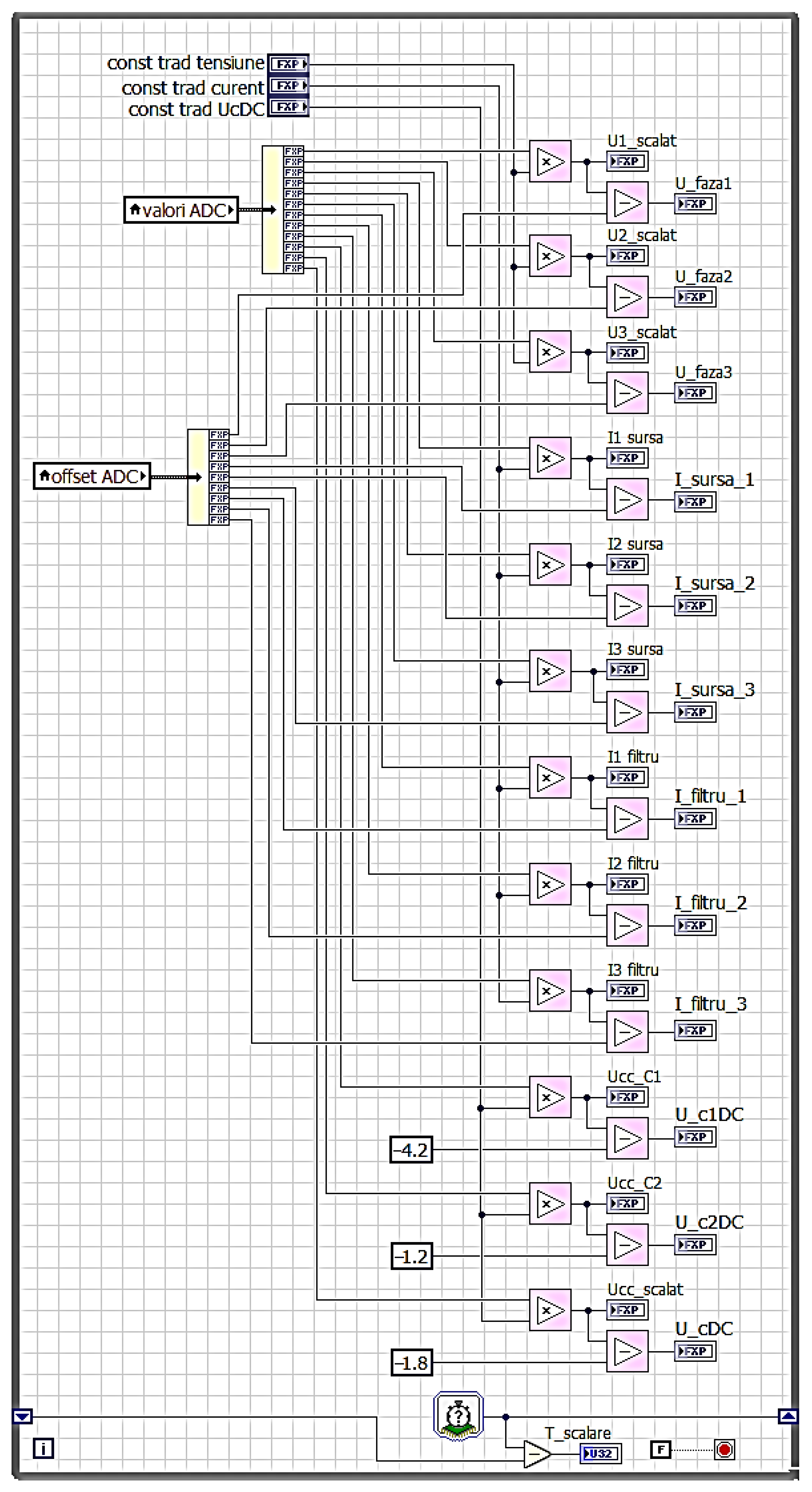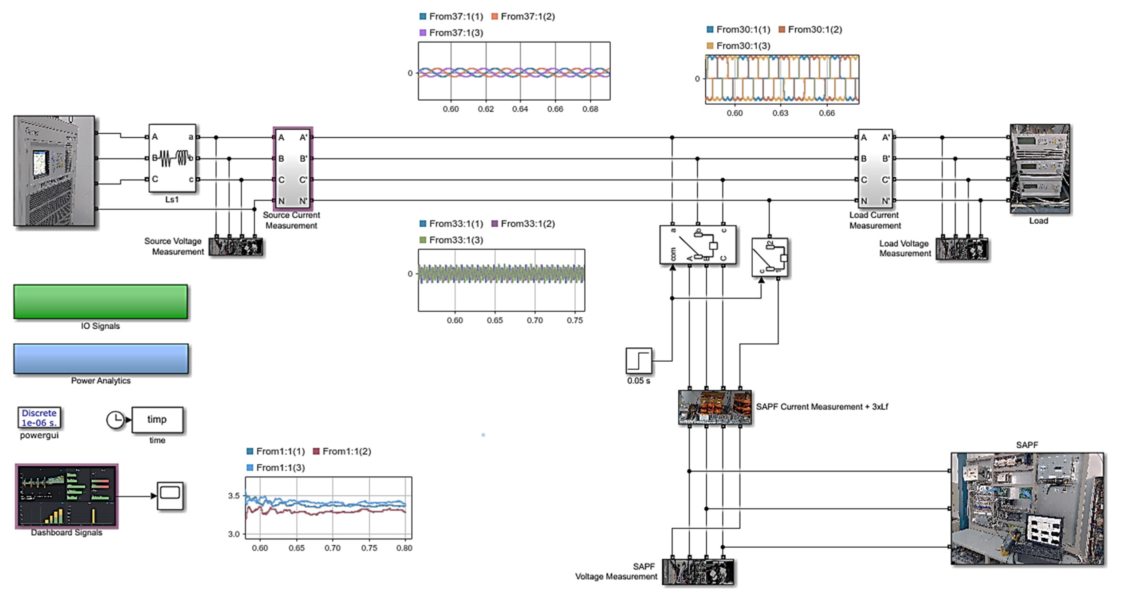 The experimental system is realized by interconnecting programmable electronic components and equipment with the aim of reducing current harmonics and compensating reactive power in electrical power supply grids. The FAP-0L experimental system allows testing filters for any configuration of the electrical grid up to 230 V alternating voltage, for both 50 Hz and 60 Hz frequencies, but also for any algorithm presented in Table 1. The limits of the described system are alternating voltage 0~330 VL-N/0~570 VL-L, voltage frequency 30~100 Hz, maximum power: 30 kVA. For the FAP-0L experimental system, the implemented control strategy unifies indirect control (8) with all control algorithms specific to industrial prototypes (1–7), without the need to change their hardware configuration (Table 1) [31,32,33,34,35,36,37,38,39,40,41].