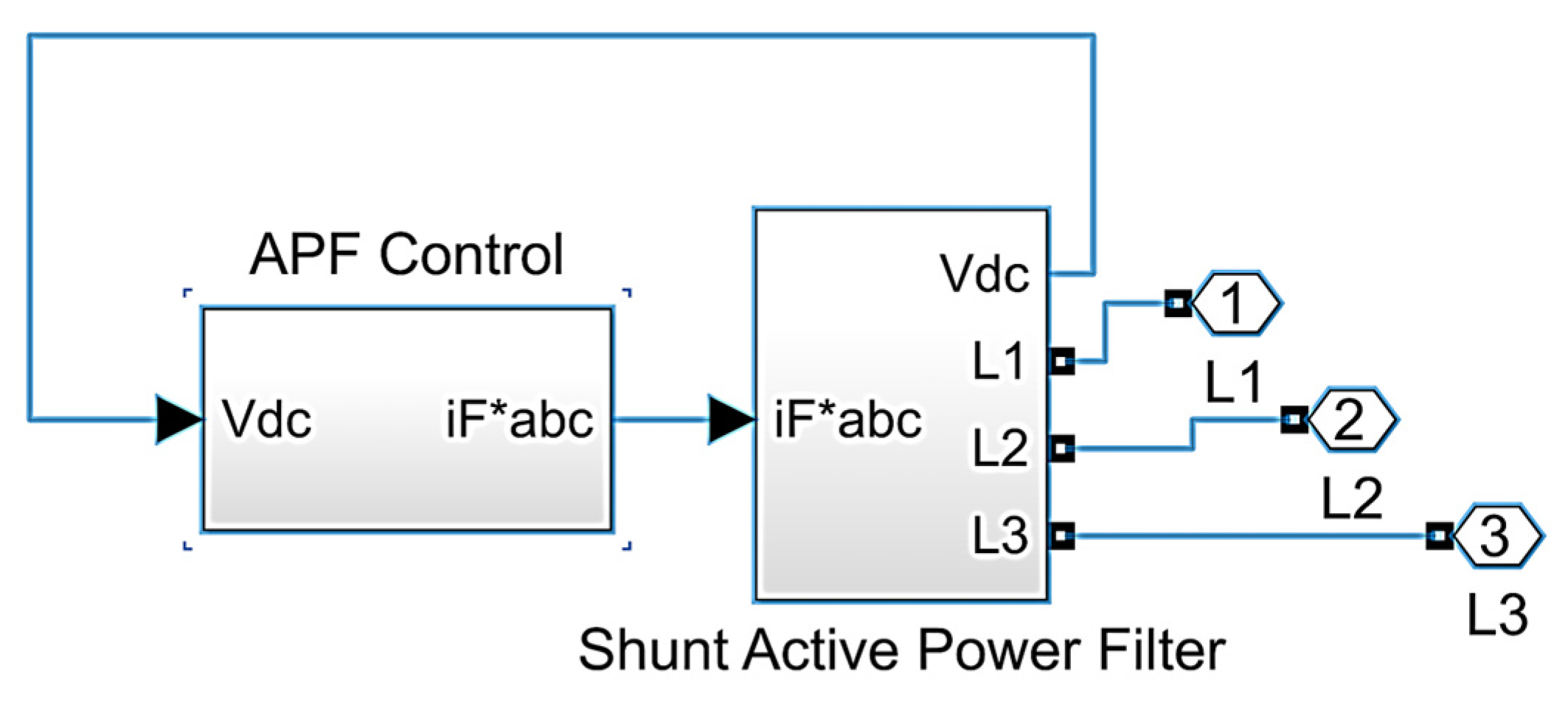 The shunt active power filter has the role of imposing an electric current of a certain shape and amplitude at the output. In order to use the power semiconductor devices efficiently, they are used in the switching mode and not in the linear mode. The power losses on the filter components are minimized, even if the spectrum of the harmonics compensated by the filter is significantly reduced below the value of the inverter switching frequency. Typically, the control signals for static switches are generated either by means of hysteresis regulators or by PWM modulators preceded by a regulator. For example, [13] presents simulation results for three control methods applied to the same hardware structure of an shunt active filter: the pq theory (instantaneous active and reactive powers) adapted to the single-phase system; the DC side voltage control method, found in other references, [14,15] as the indirect control method, which obtains useful information from the voltage variation at the terminals of the active filter capacitor; the nonlinear load average power method, which calculates the load average power by filtering the result of multiplying the instantaneous values of voltage and current. Research in this field [13,14,15,16,17], etc., does not converge towards a unique solution, valid for any energy system and any disturbance, but rather offer optimal solutions for each particular system. It is not a matter of the impossibility of creating such an active power filter, but the complexity and cost of implementation. The success of the solution comes from the efficiency of the solution (from as many points of view as possible). The active power filters should meet the approved power quality standards [18,19,20].