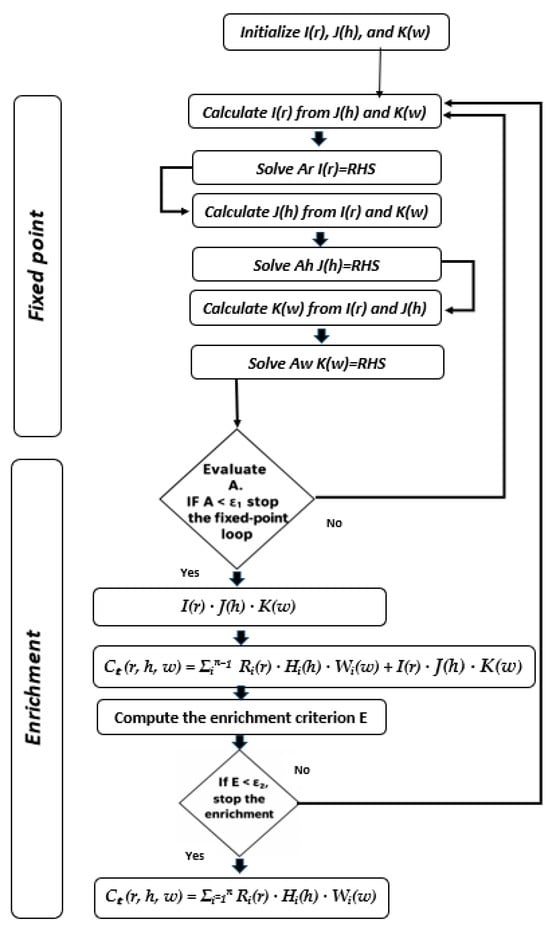 We now wish to compute the next term , , and to obtain the enriched PGD solution. At the current enrichment step n, all functions , , and are unknown and take the form of a product. Thus, the resulting problem is nonlinear, necessitating a suitable iterative scheme.